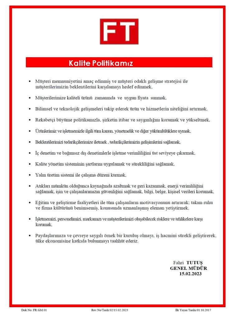 ISO 9001:2015 ve ISO 14001:2015 belgesi sahibi bir şirket olarak, üretim planlamadan, nihai ürün sevkiyatına ve müşteri ilişkileri yönetimine kadar kaliteyi tüm iş süreçlerimizde çok ciddi bir şekilde ele alıyoruz.